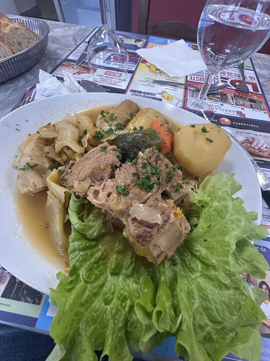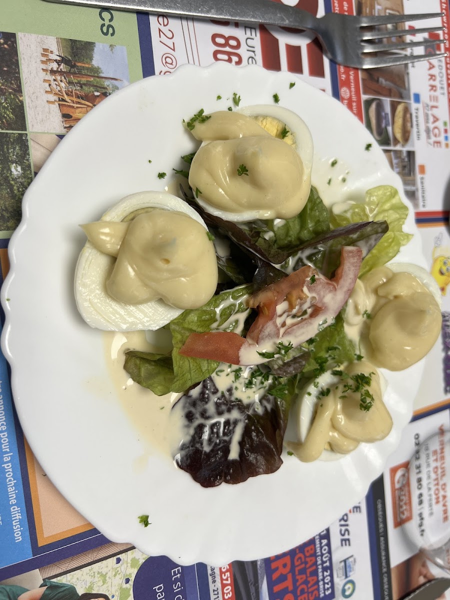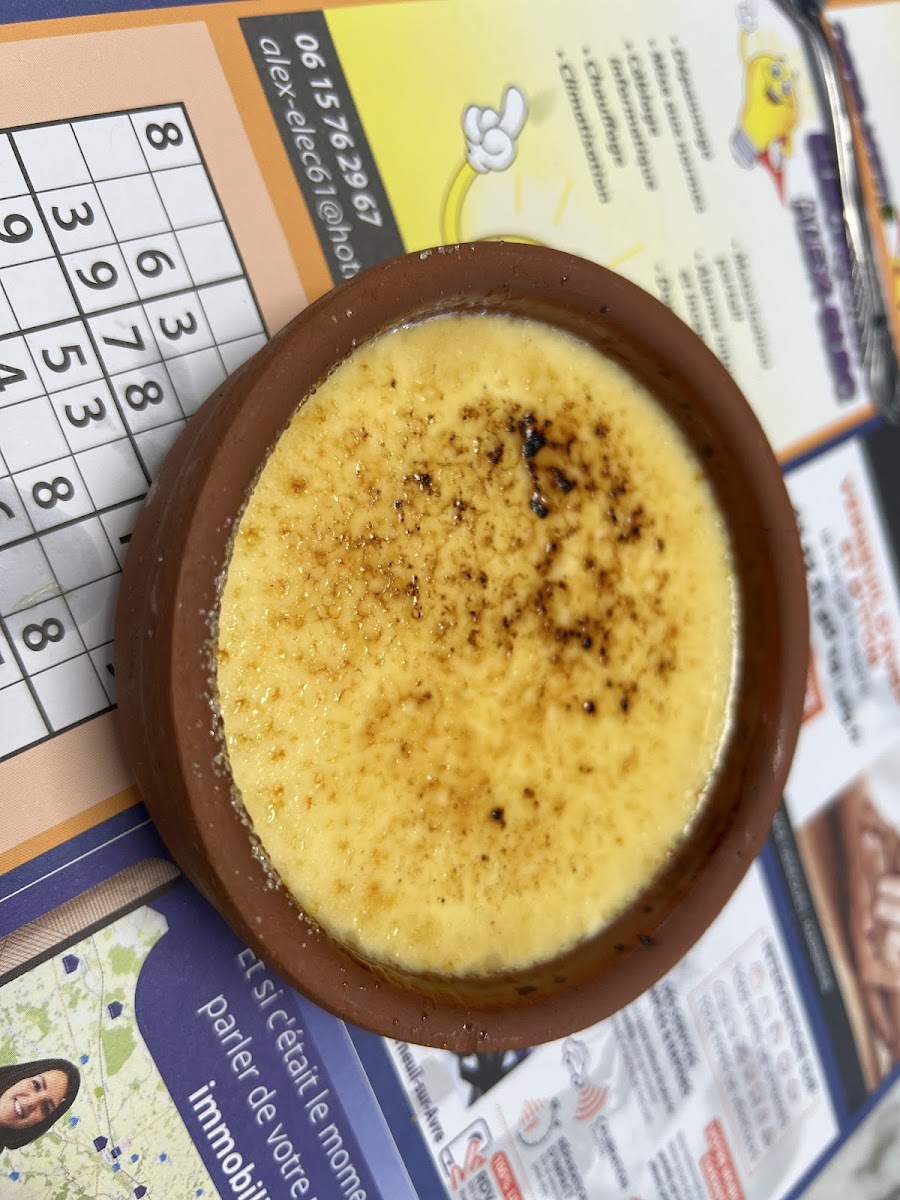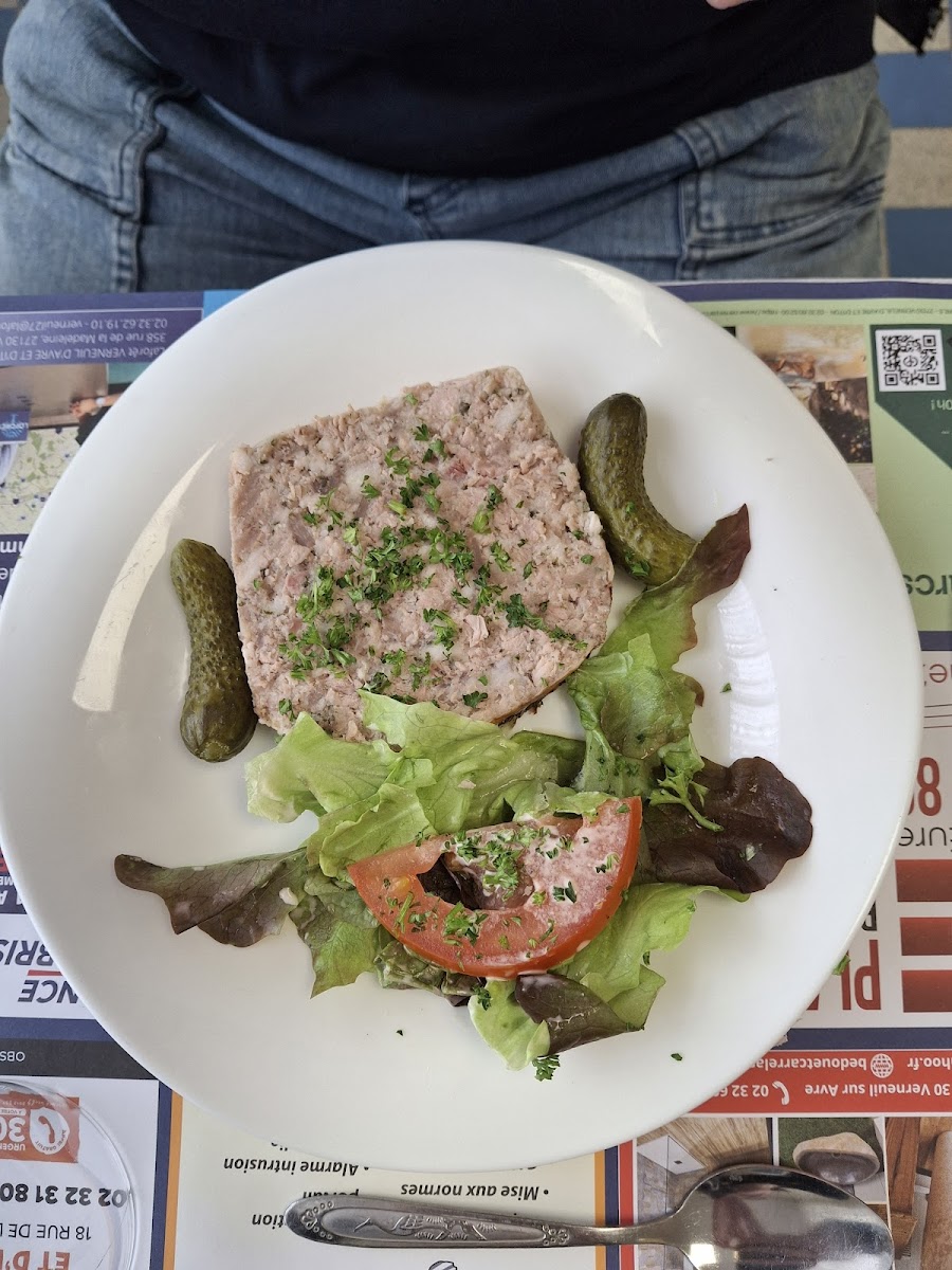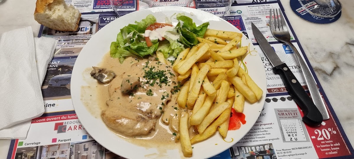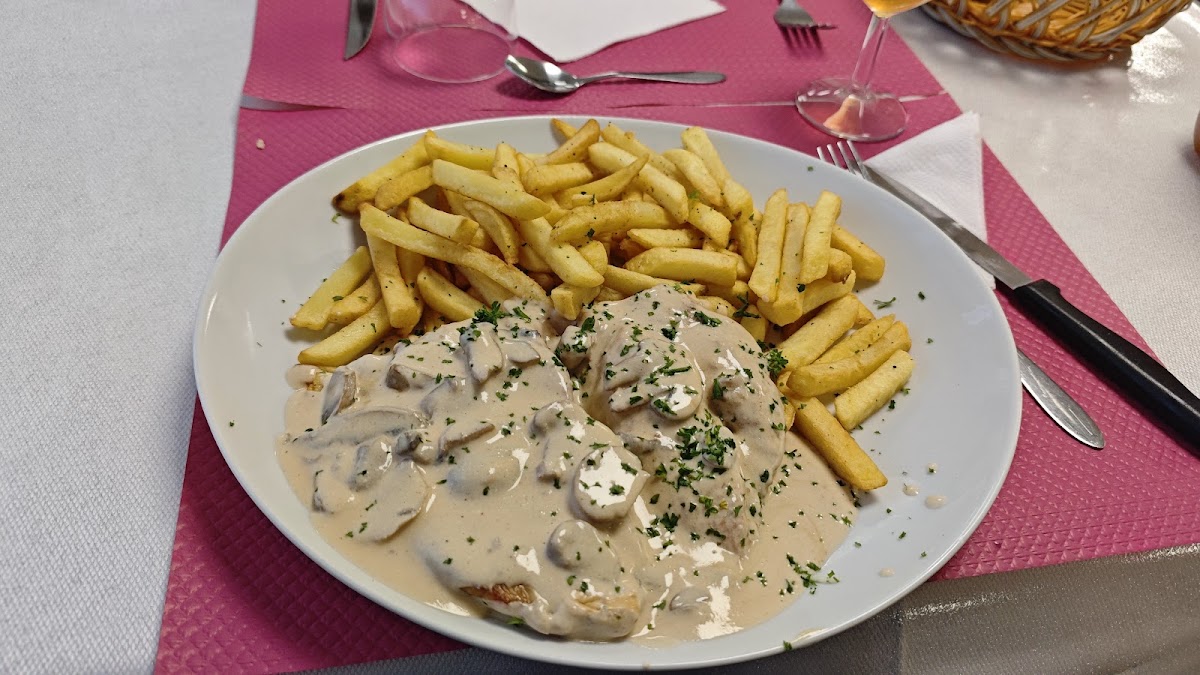 The menu leans on classic French comfort dishes, with highlights like Escalope Normande, Moules Frites, and homemade terrines and desserts such as Tiramisu Maison and Crème Brûlée. These are straightforward plates you’d expect to find in a countryside relais — hearty, honest, and filling. This is a place where you can settle in for a proper breakfast or a relaxed lunch before continuing your journey.