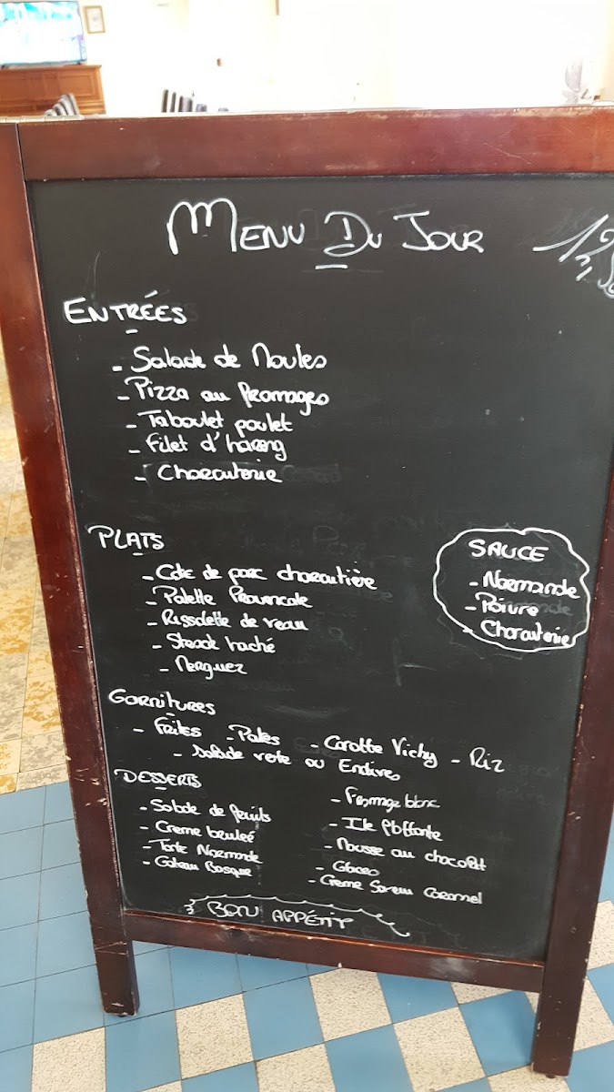 For dessert, the menu includes classic French options such as Crème Brûlée, Tarte Aux Poire, Tiramisu Maison, and Terrine Maison. Beverages typically complement the food offerings, with bar service providing a range of drinks suited for various times of the day.